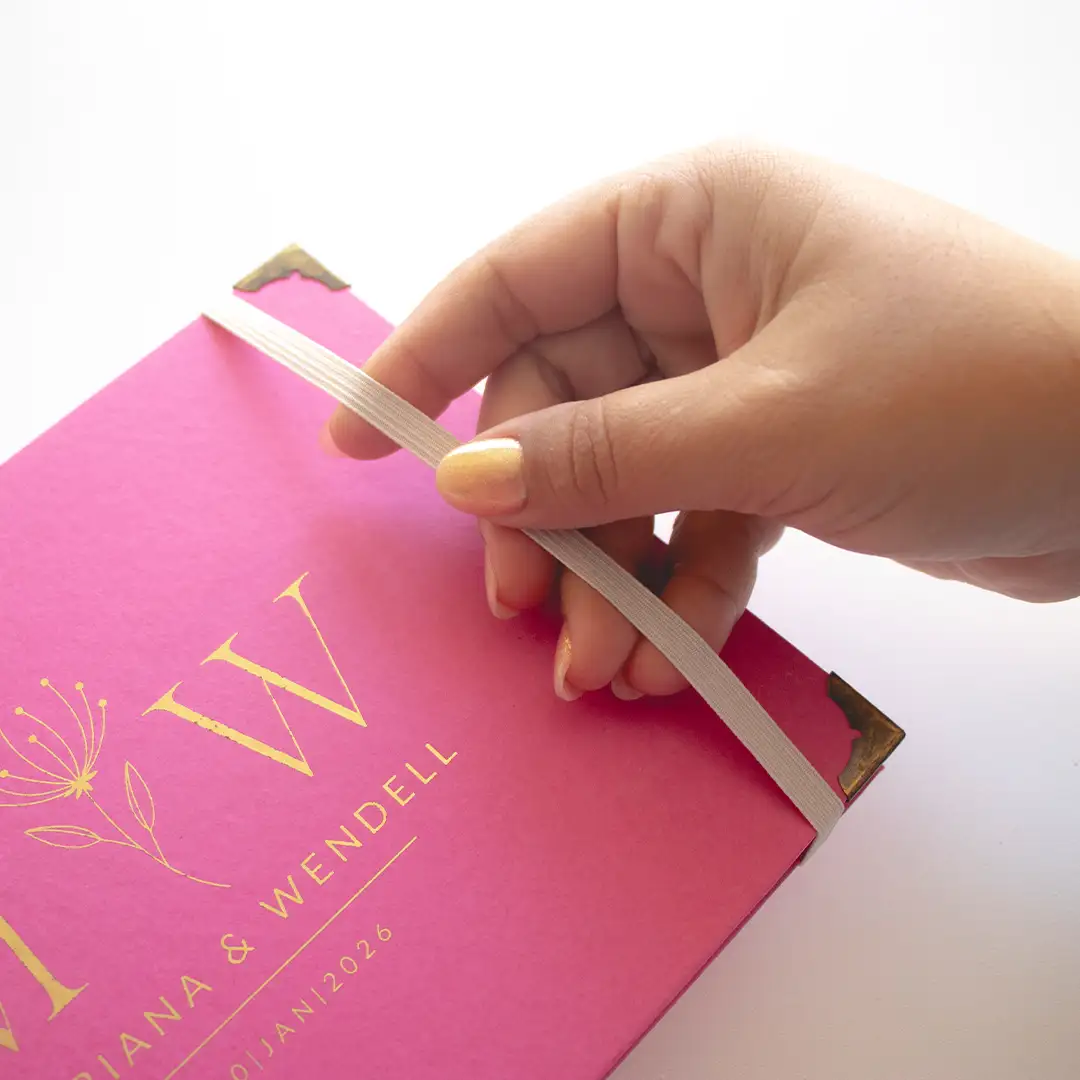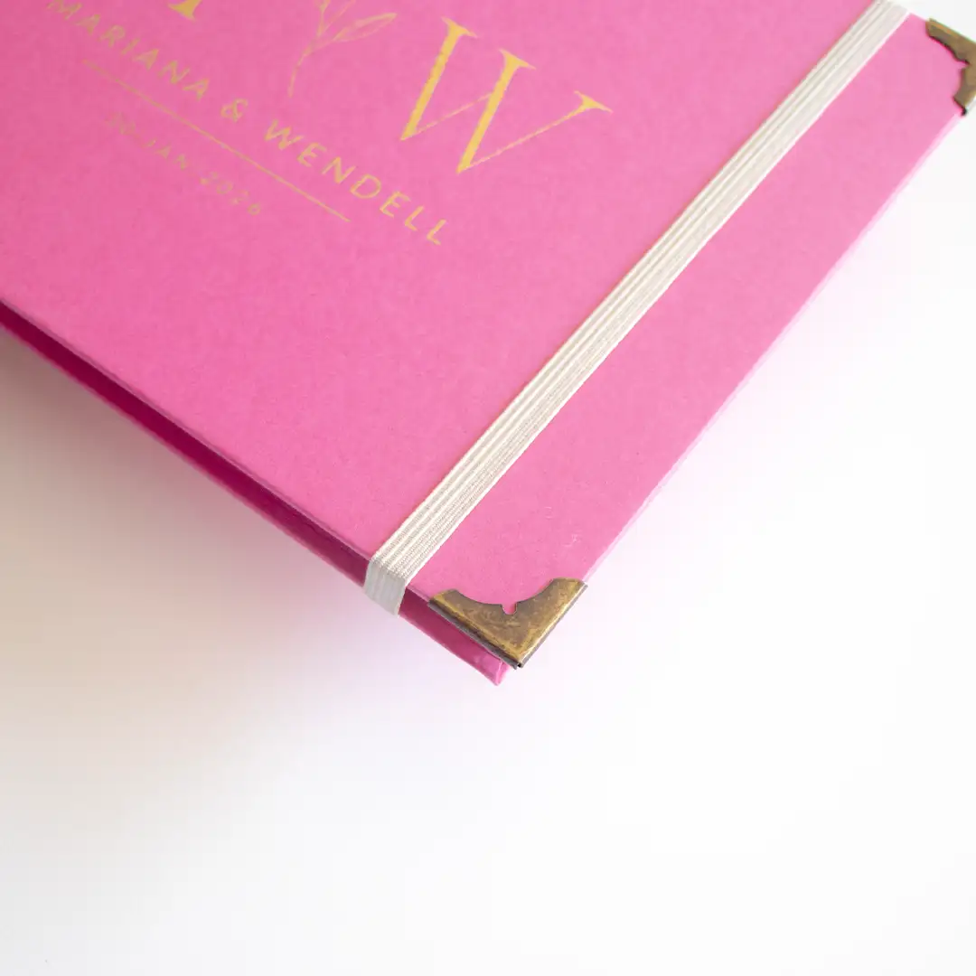 O design une capa firme, metais envelhecidos e acabamento preciso. Isso traz mais charme e cria um livro durável. O Livro para Fotos e Mensagens de Casamento – Lóris Fúcsia celebra a história dos noivos e transforma mensagens e imagens em memórias que ganham vida.